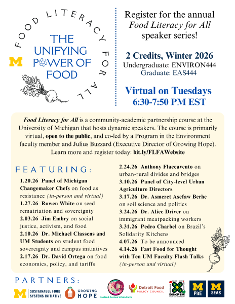 Food Literacy for All is a community-academic partnership course at the University of Michigan supported by the Sustainable Food Systems Initiative, Program in the Environment, School for Environment & Sustainability, and our Michigan-based community partners.