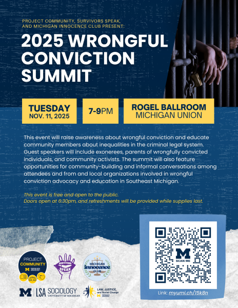 This event will raise awareness about wrongful conviction and educate community members about inequalities in the criminal legal system. Guest speakers will include exonerees, parents of wrongfully convicted individuals, and community activists. The summit will also feature opportunities for community-building and informal conversations among attendees and from and local organizations involved in wrongful conviction advocacy and education in Southeast Michigan.