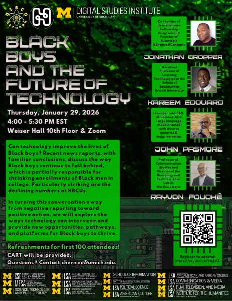 | Source: | Happening @ Michigan from Digital Studies Institute, Science, Technology, and Public Policy (STPP) Program, Department of Afroamerican and African Studies, School of Information, Department of Film, Television, and Media, Computer Science and Engineering Division, Department of American Culture, Science, Technology and Society, Multi Ethnic Student Affairs - MESA, Communication and Media, Department of English Language and Literature, Department of Political Science, Trotter Multicultural Center, Program in Computing for Arts and Science |