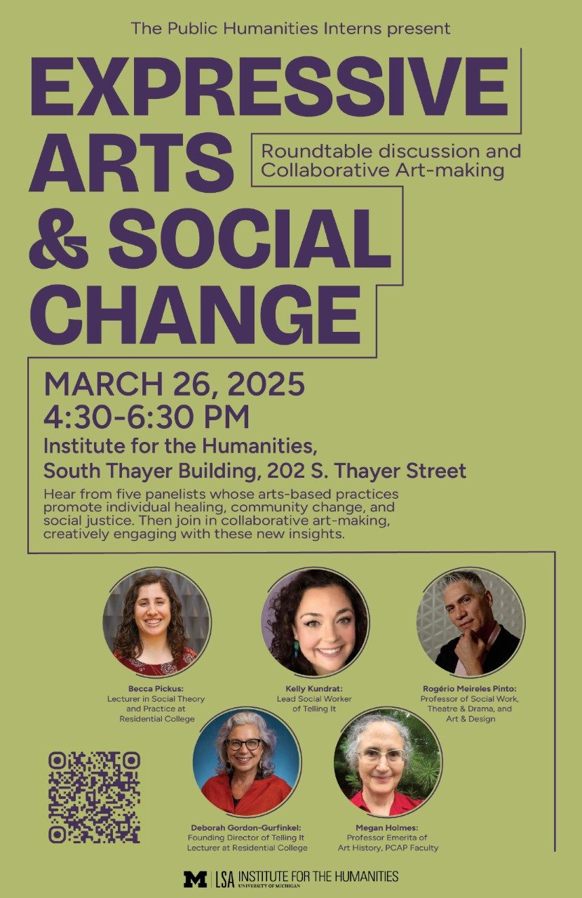Becca Pickus (Lecturer in Social Theory and Practice at Residential College), Kelly Kundrat (Lead Social Worker of Telling It), Rogério Meireles Pinto (Professor of Social Work, Theatre & Drama, and Art & Design), Deborah Gordan-Gurfinkel (Founding Director of Telling It, Lecturer at Residential College), and Megan Holmes (Professor Emerita of Art History, PCAP Faculty) shared their unique practices and discussed the empowering role of expressive arts in individual healing, community change, and social justice.