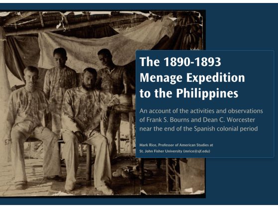 For an in-depth exploration of the Menage Expedition, including additional photographs, visit: The 1890-1893 Menage Expedition to the Philippines: An account of the activities and observations of Frank S. Bourns and Dean C. Worcester near the end of the Spanish colonial period. Created by Mark Rice, professor of American studies at St. John Fisher University and author of Dean Worcester’s Fantasy Islands: Photography, Film, and the Colonial Philippines (University of Michigan Press, 2014).