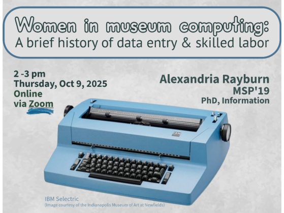 The Museum Studies Program presents Alexandria Rayburn, a PhD student in information at U-M, who will speak on women in museum computing as part of the Museums at Two lecture series. The lecture, "Women in Museum Computing: A Brief History of Data Entry and Skilled Labor," will take place online at 2 p.m. on Thursday, October 9.