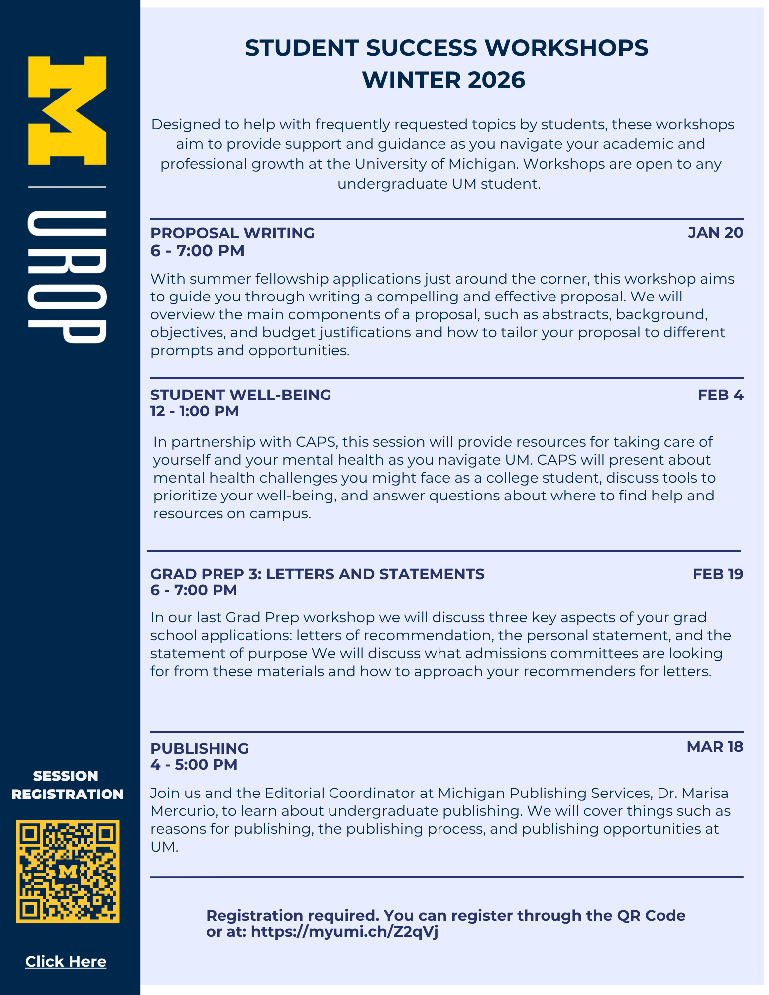 Designed to help with frequently requested topics by undergraduate student scholars, these workshops aim to provide support and guidance as students navigate their academic, research, and professional growth at the University of Michigan. Workshops are open to any undergraduate UM student. These workshops provide essential training, tools, and strategies for undergraduate researchers to discover, secure, and succeed in research, creative projects, and scholarly activities across all disciplines.
